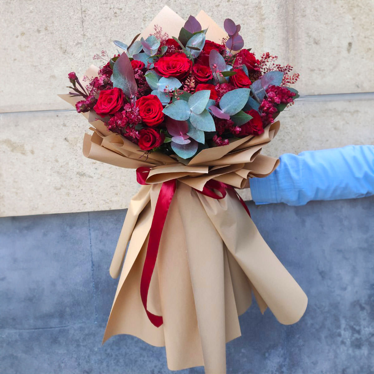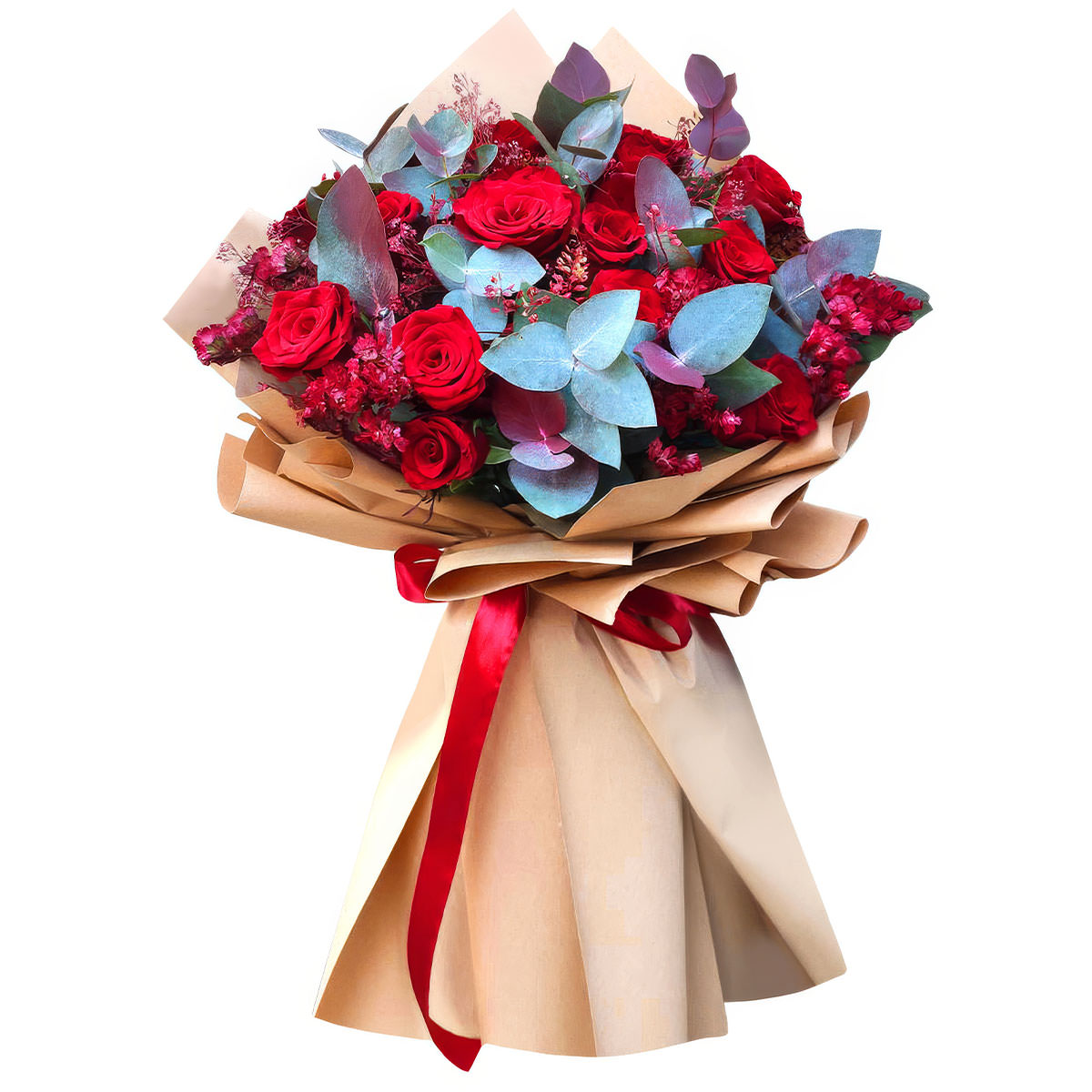 Яркие красные и зелёные оттенки букета создают атмосферу страсти и свежести. В композиции использованы красные кустовые розы и эвкалипт, подчеркивающие выразительность и стиль. Букет оформлен в крафт-бумагу, перевязанную атласной красной лентой, что придаёт ему изысканность. Идеально подходит для поздравления любимой женщины на годовщину.