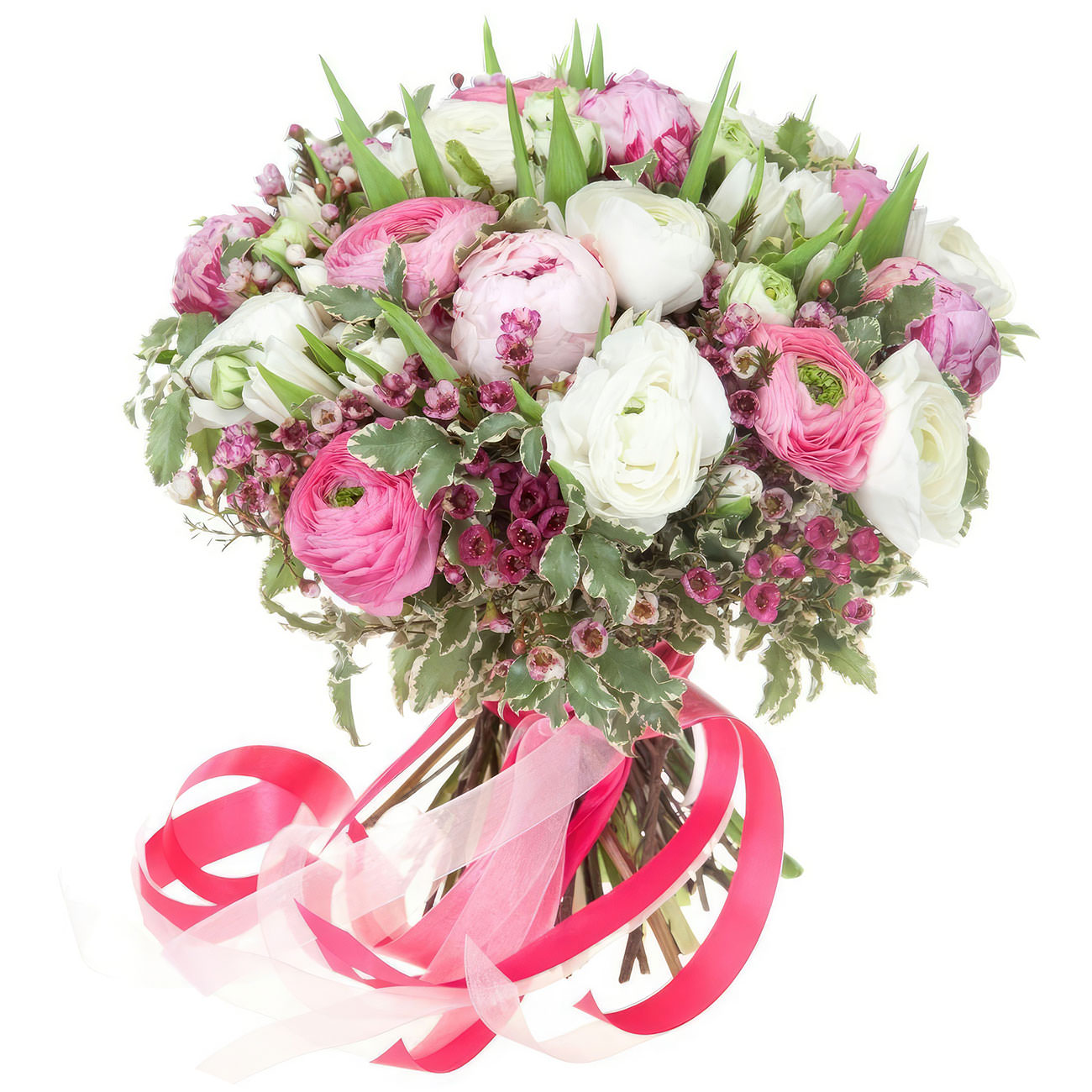 Этот букет восхищает нежностью розовых и белых оттенков. В составе: ваксфлауэр, белые и розовые ранункулюсы, розовые пионы. Композиция украшена яркой атласной лентой, что придаёт ей особый шарм. Она создаёт атмосферу романтики и свежести. Прекрасно подойдёт для поздравления любимой на День Святого Валентина.