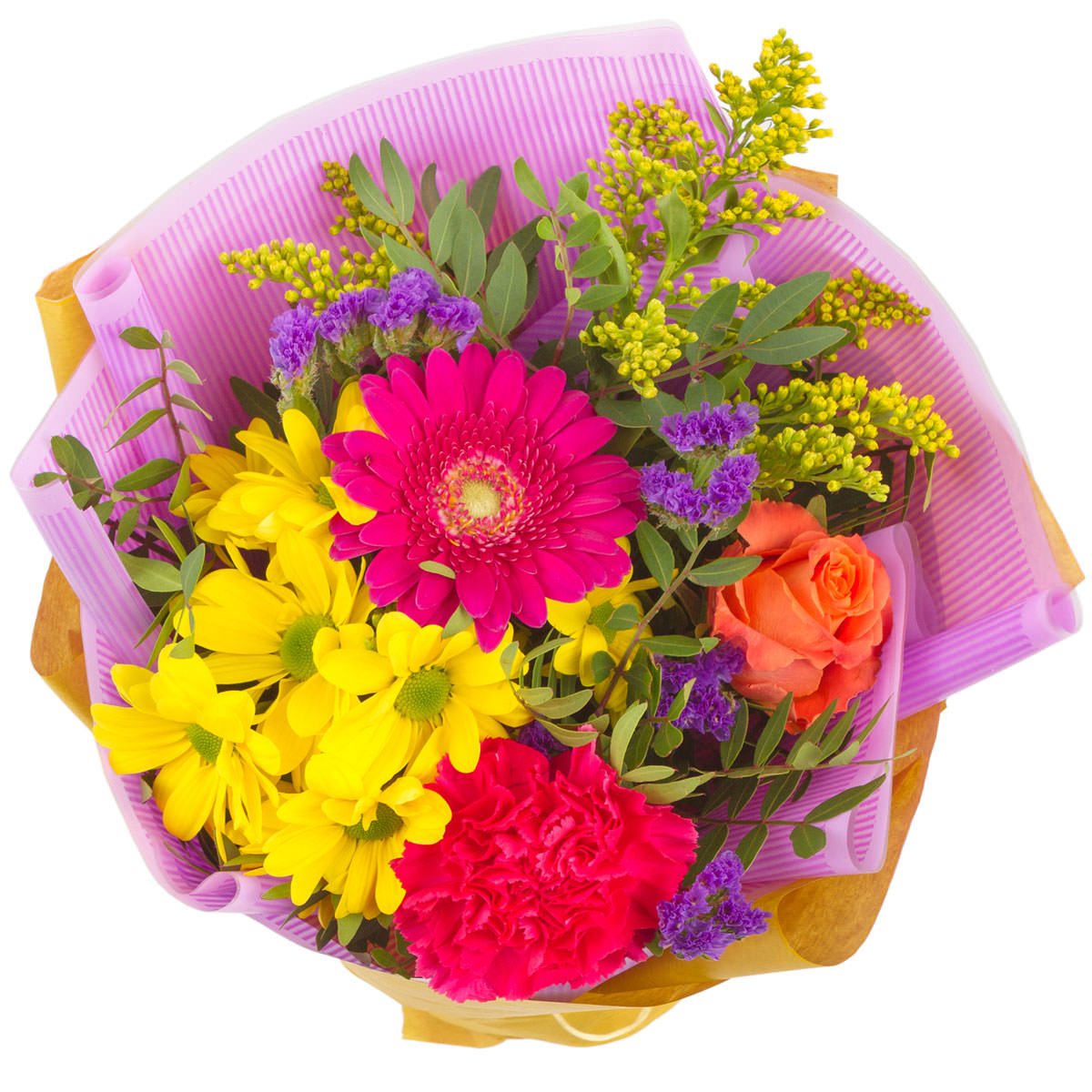 Сочетание ярких жёлтых хризантем и розовых гербер создаёт атмосферу радости и тепла. В букете также присутствуют розовые гвоздики, оранжевые розы, фиолетовая статица, солидаго и фисташка. Упаковка выполнена из жёлтой крафт-бумаги и украшена матовой плёнкой с розовым оттенком. Этот букет оживит любое пространство и станет идеальным подарком для мамы на День Святого Валентина.
