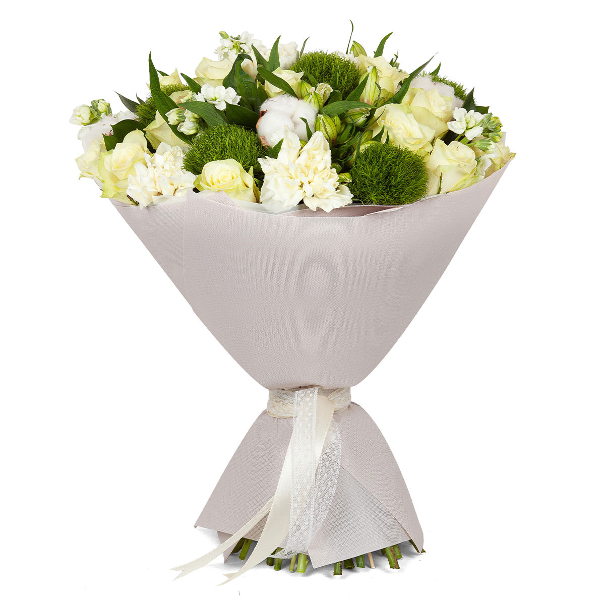 Этот букет дарит атмосферу нежности и свежести благодаря белым розам и маттиоле. В составе также диантус Грин трик и хлопок, что придаёт композиции оригинальность. Упакован в мягкий белый фетр с элегантной атласной лентой. Прекрасный подарок для любимой женщины на годовщину.
