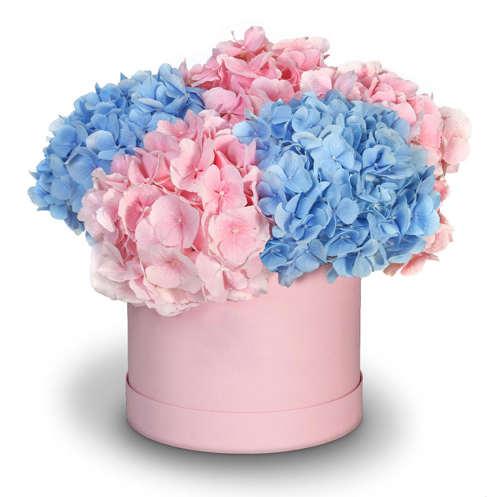 Пастельные розовые и голубые оттенки гортензии создают атмосферу лёгкости и нежности. Гортензия микс (розовая, голубая) гармонично расположена в шляпной коробке нежно-розового цвета. Такая композиция добавит изысканности любому интерьеру. Идеально подойдёт для поздравления любимой женщины на День семьи, любви и верности.
