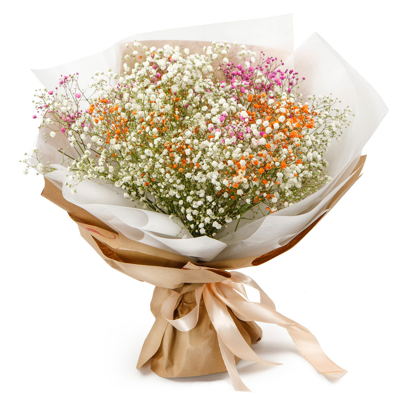 Эти яркие оттенки белой, оранжевой и розовой гипсофилы создают атмосферу радости и лёгкости. Букет собран из белой, оранжевой и розовой гипсофилы. Упакован в крафт-бумагу с белой матовой плёнкой и украшен атласной лентой. Композиция вносит тепло и уют в любое пространство. Прекрасно подойдёт для поздравления молодой мамы на День матери.