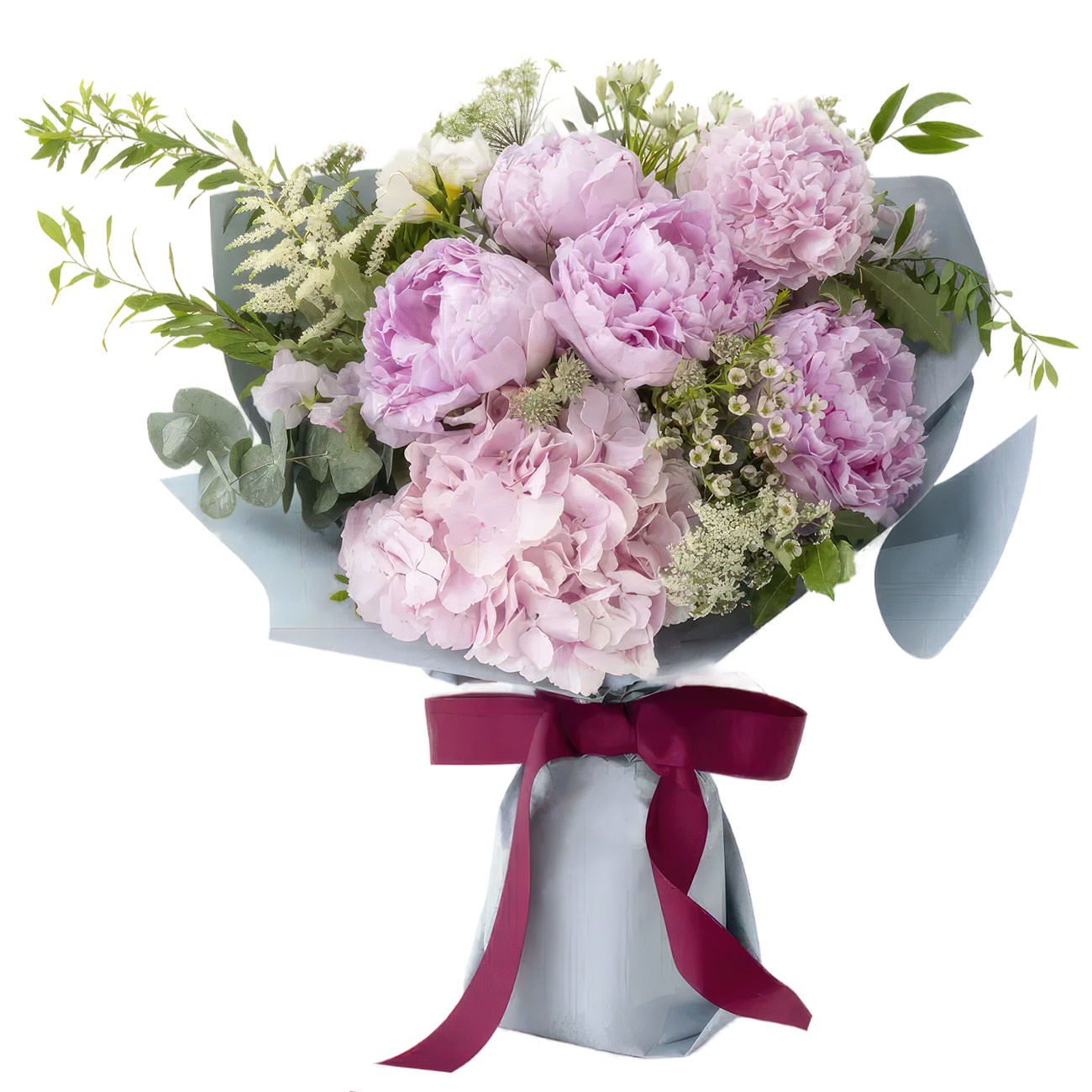 Этот букет создаёт атмосферу нежности благодаря розовым пионам и гортензии, дополненным белой эустомой, зеленью и эвкалиптом. Композиция оформлена в матовую плёнку и перевязана насыщенной фиолетовой лентой. Прекрасно подойдёт для празднования юбилея с любимой женщиной.