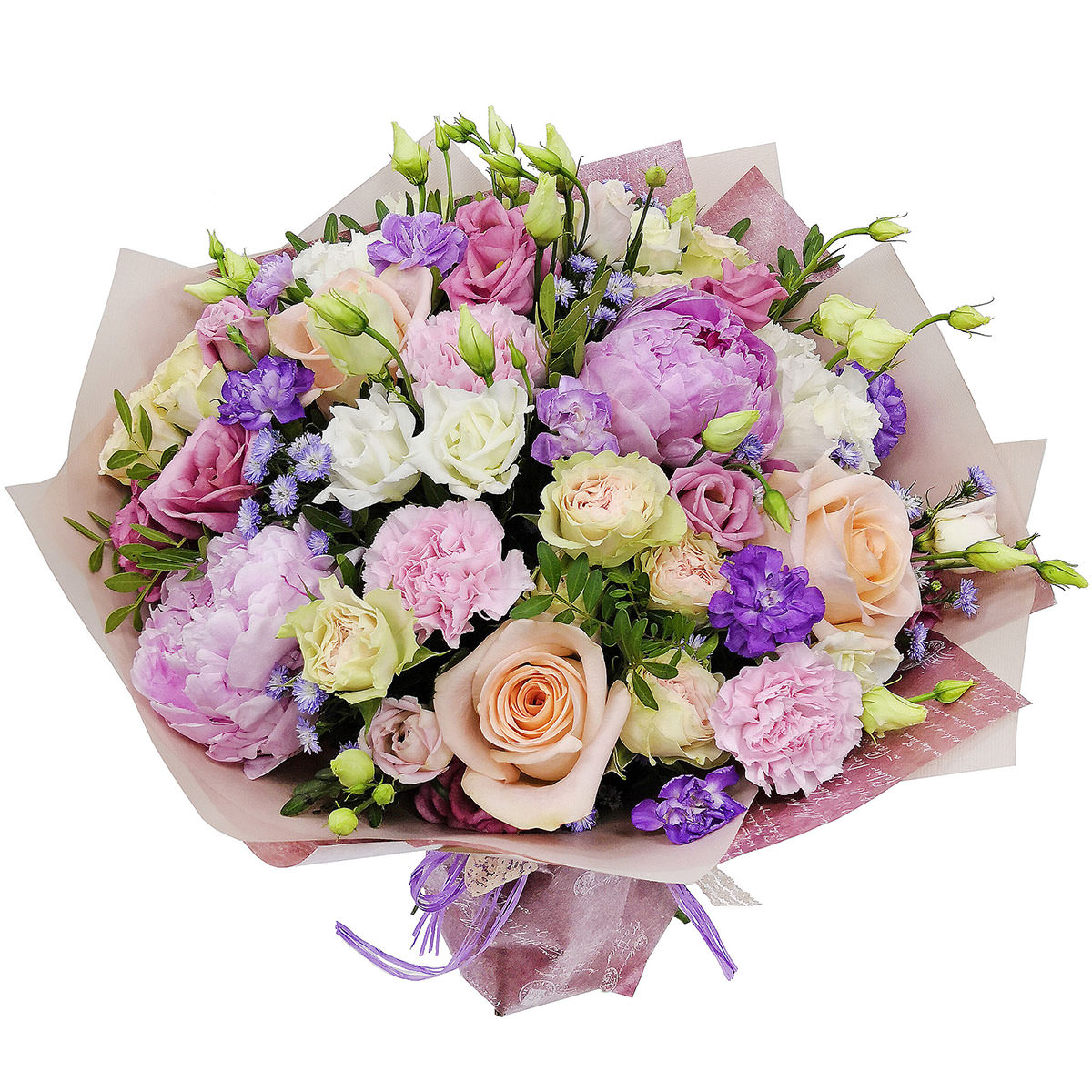 Очарование нежных розовых и кремовых оттенков создаёт атмосферу утренней свежести и легкости. В букете использованы розовые пионы, одноголовые кремовые розы, белая и розовая эустомы, розовые гвоздики, кустовые кремовые розы и фиолетовая маттиола, дополненные фисташкой. Упаковка выполнена из матовой пленки и крафт-бумаги, перевязанная лавандовой лентой. Дарит радость и свет, идеально подойдет для встречи выпускников или в подарок для сестры.