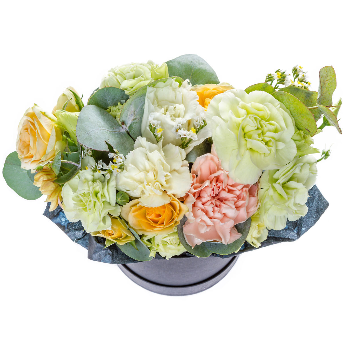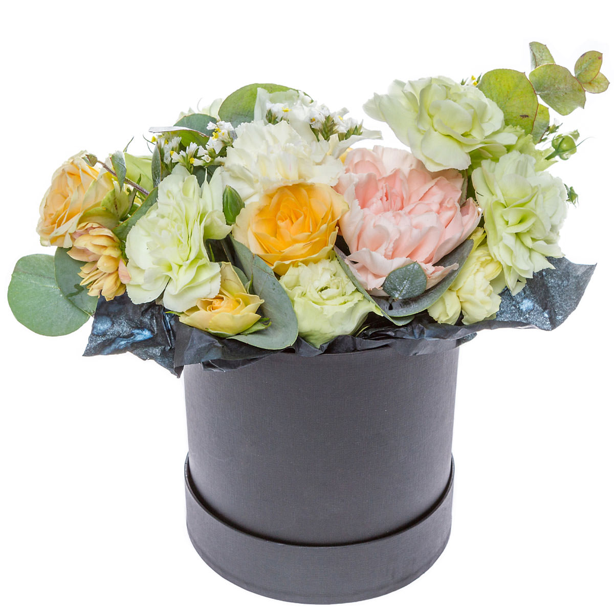 Эта композиция привносит утреннюю свежесть и нежность в пастельных тонах. Внутри: роза кустовая желтая, пион розовый, гвоздика бело-зеленая, эустома белая, хризантема кустовая персиковая, статица белая и эвкалипт. Упаковано в стильную шляпную коробку тёмного цвета. Создаёт атмосферу утонченности и подходит для благодарности учителю. Отличный подарок для преподавателя на выпускной вечер.