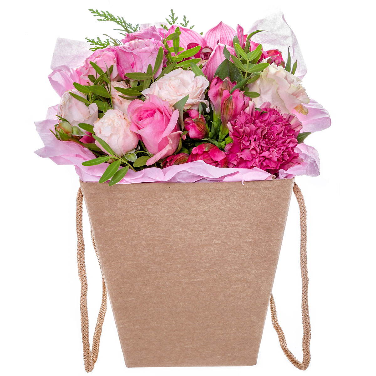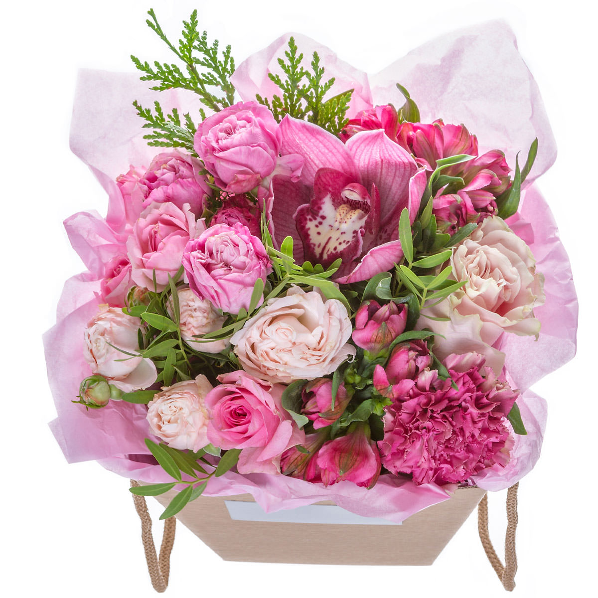 Эта нежная композиция в розовых тонах включает розу одноголовую розовую, светло-розовый пион, розовую альстромерию, розовую орхидею и розовую гвоздику, украшенную зеленью туи и фисташки. Цветы расположены в элегантной шляпной коробке с ручками, выполненной из крафт-материала, что добавляет композиции стиль и изысканность. Букет создаёт атмосферу романтики и нежности. Прекрасный подарок для подруги на День Святого Валентина.