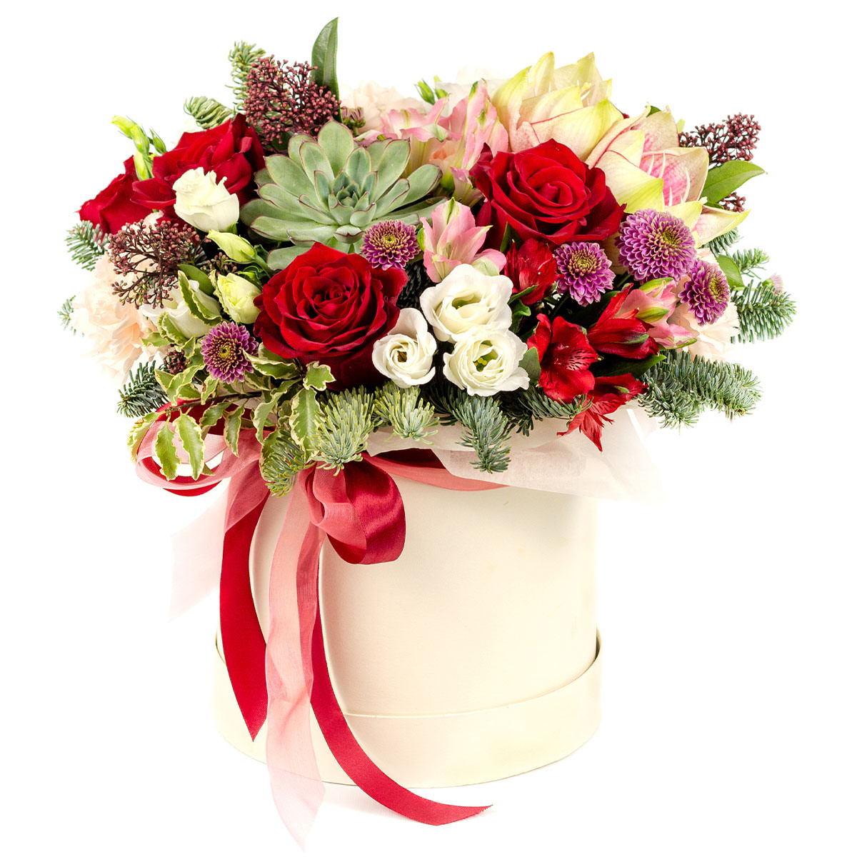 Эта композиция дарит ощущение нежности и гармонии благодаря сочетанию красной розы, суккулента, белой эустомы, розовой и красной альстромерии, сиреневой кустовой хризантемы, амариллиса, нежно розовой гвоздики, хвои, скиммии и нобилиса. Все цветы аккуратно размещены в элегантной круглой шляпной коробке, украшенной красной лентой. Композиция создаёт атмосферу торжества и уюта. Идеально подойдёт для поздравления коллеги с повышением, для начальника.
