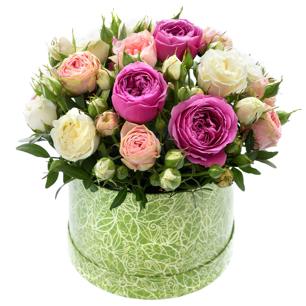 Эта композиция в пастельных сиреневых, розовых и белых тонах создаёт атмосферу нежности и романтики. В состав входят сиреневые пионовидные розы и кустовые розовые и белые розы. Цветы оформлены в круглой коробке с зелёным узором. Идеальный подарок для любимой на годовщину, который принесёт радость и уют.